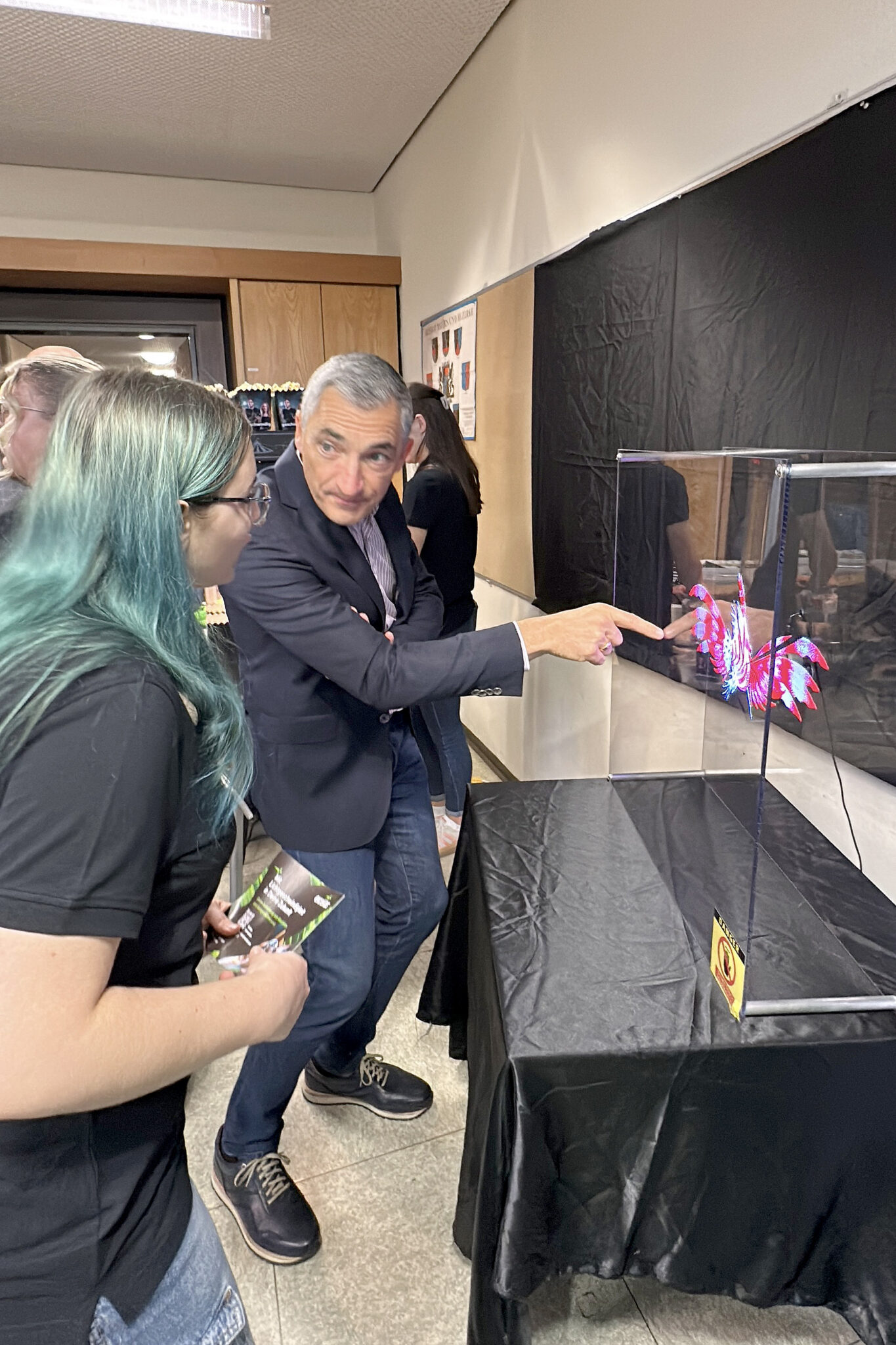 Viele Firmen hatten auch technische Besonderheiten mit dabei. Hier staunte Landrat Dr. Ronny Raith, wie ein bewegtes Bild zwischen zwei Glasplatten entstehen kann. Foto Heiko Langer / Landratsamt Regen