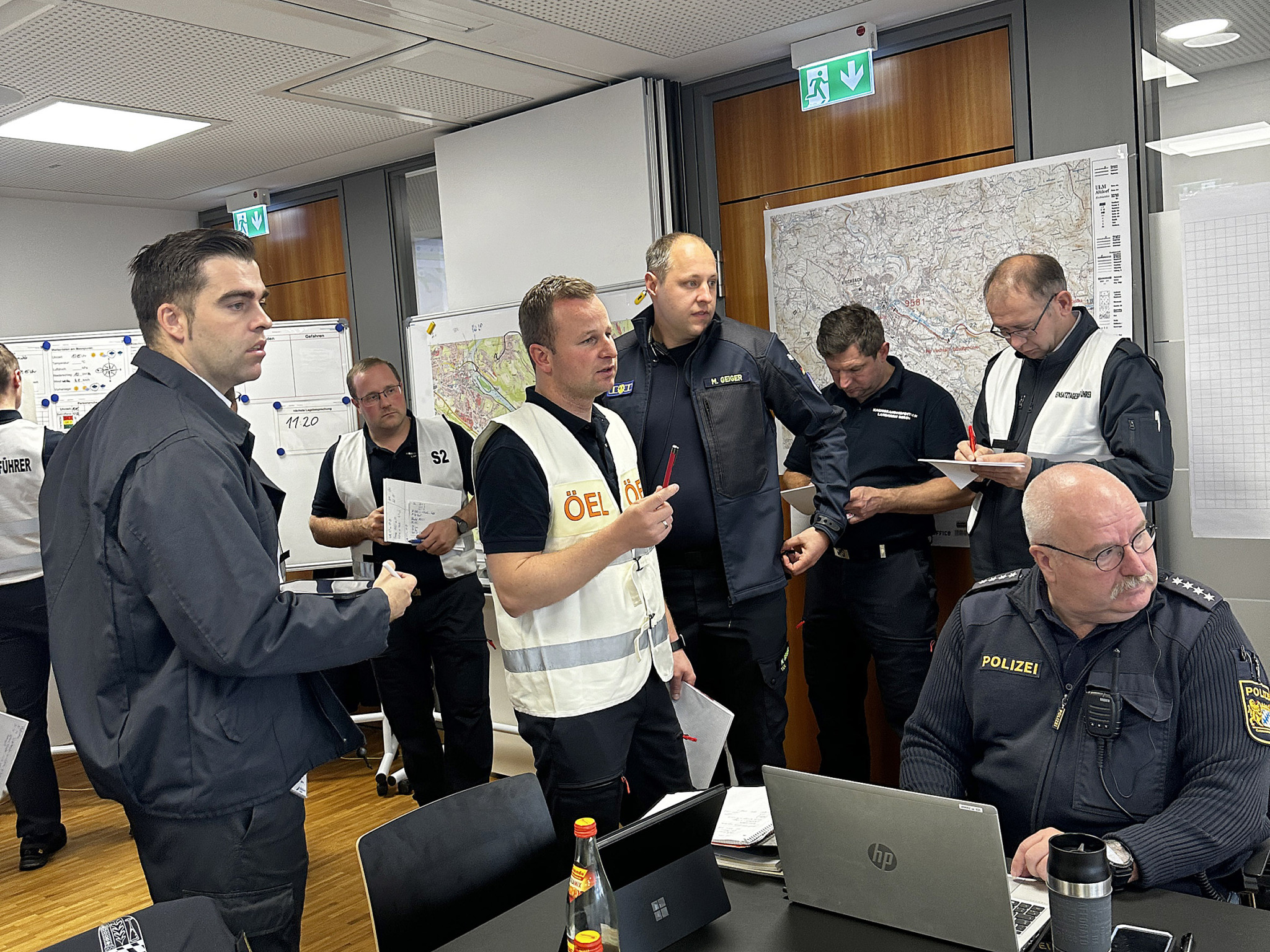 In der Örtlichen Einsatzleitung, kurz ÖEL, hatten Kreisbrandmeister Tobis Ertl und seine Mitstreiter die Lage im Griff. Foto: Heiko Langer / Landratsamt Regen