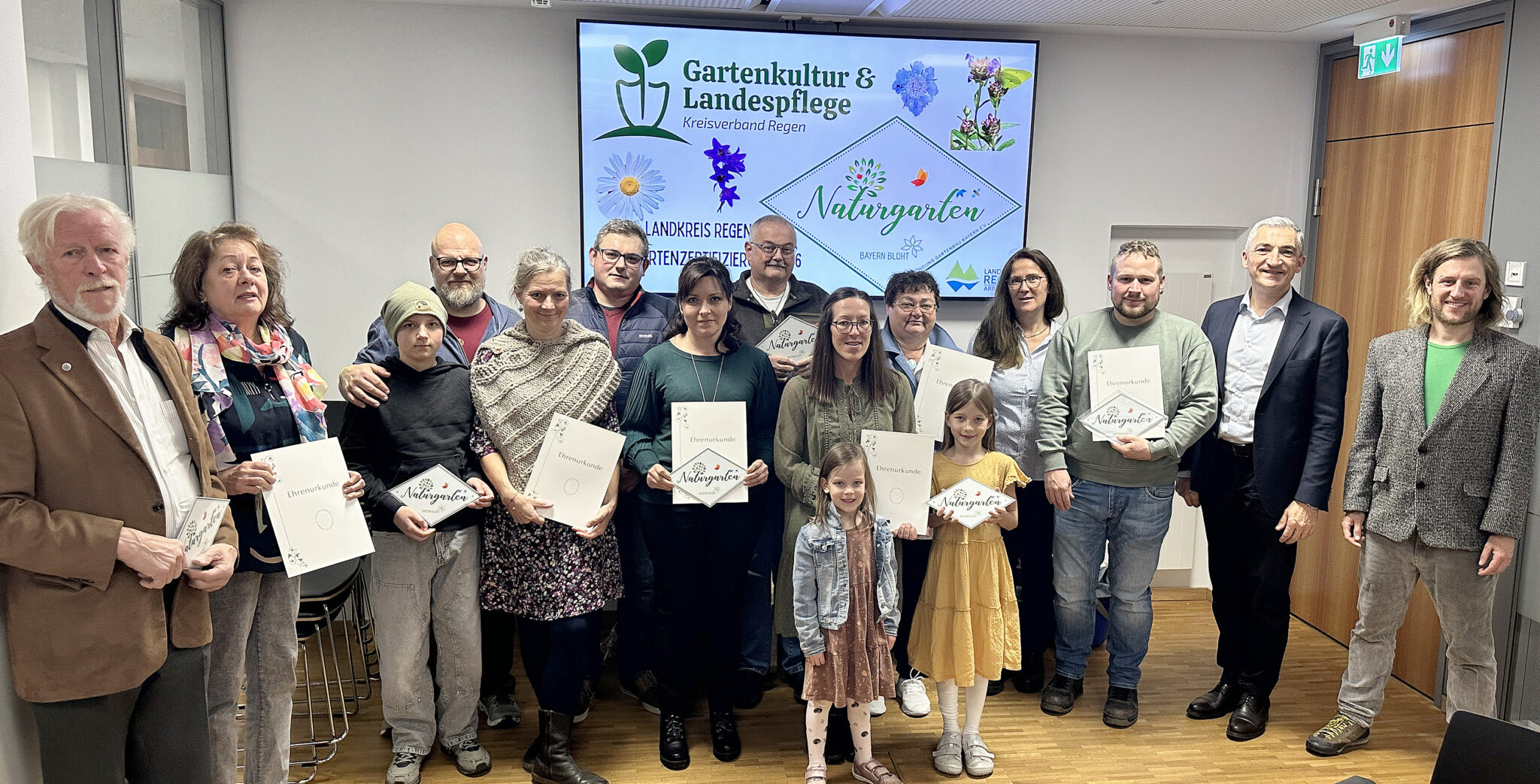 Seit mittlerweile sechs Jahren gibt es in Bayern die Zertifizierung „Bayern blüht – Naturgarten“, im Landkreis Regen unterstützen die Gartenbauvereine die Aktion von Beginn an. Der Kreisgeschäftsführer und Kreisfachberater Martin Straub und Monika Knauf-Schöllhorn, seine Kollegin aus dem Umweltamt, sind als Zertifizierer mehrmals pro Jahr gefragt. Sie besuchen die Gärten und überprüfen die Kriterien. „Es gibt viel zu beachten, vom wilden Eck über den Verzicht auf Torf bis hin zur Regenwassernutzung, um nur einige Kriterien zu nennen“, erklärte Straub und der Landrat ergänzte: „Sie alle haben die notwendigen Voraussetzungen nachgewiesen und so dürfen wir Ihnen heute die Urkunde und das dazugehörige Emailleschild überreichen.“