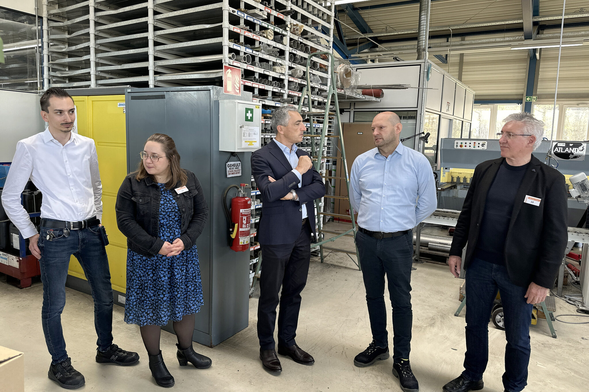 Hans-Peter Amann, Leiter des Bereichs Petro, Tobias Dold, Leiter der Heiztechnik, Eric Neveling, Betriebsleiter Heiztechnik, und Markus Bielmeier, Betriebsleiter Petro, empfingen die Delegation. Rund 160 Mitarbeiter, darunter zwölf Auszubildende, arbeiten fest am Standort – in den Bereichen Petro, elektrische Heiztechnik und Verwaltung.