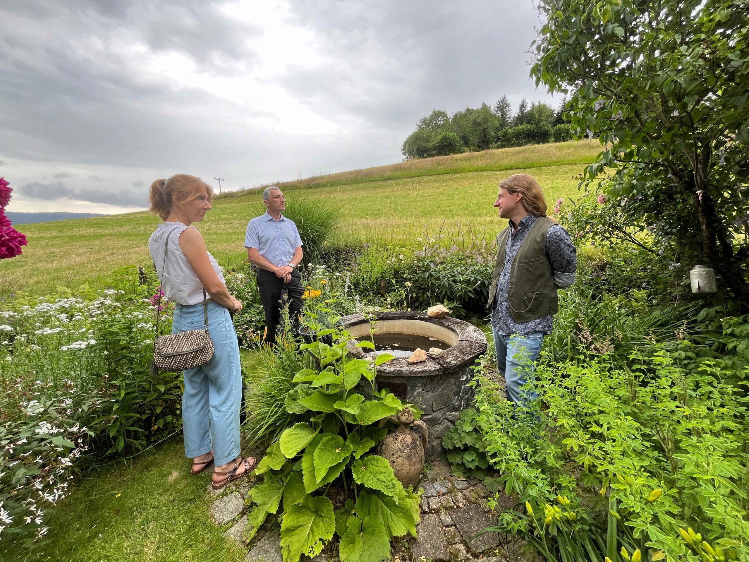 - Im Garten von Familie Zahlauer öffnet sich der Blick in die Ferne. V. li.: Sonja Raith, Landrat Dr. Ronny Raith und Kreisfachberater Martin Straub. Foto: Iris Gehard / Landratsamt Regen