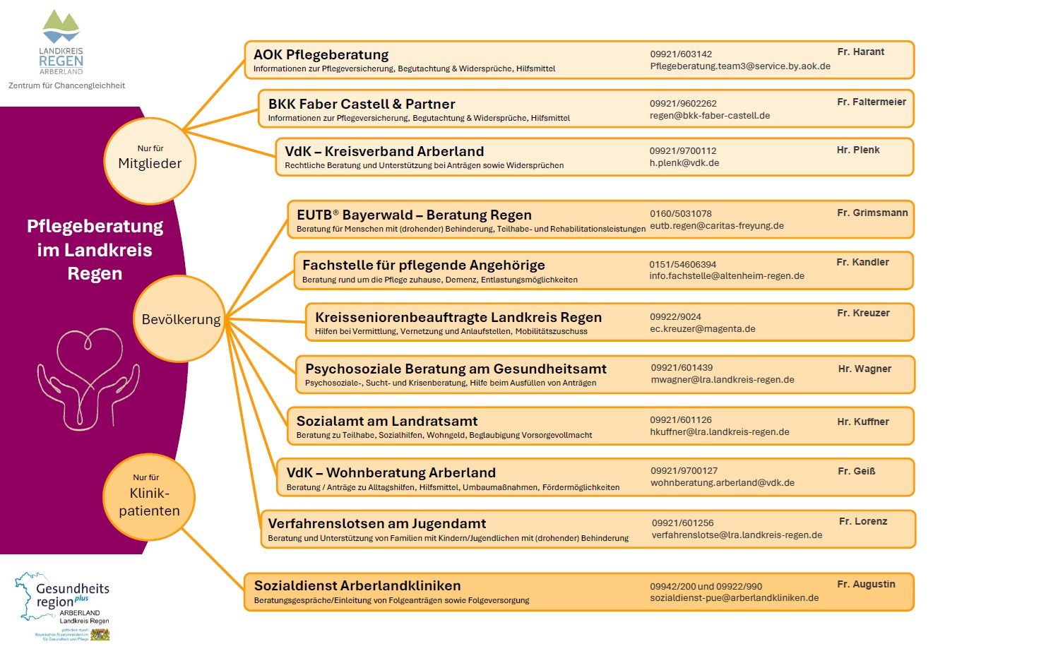 Das nachfolgende Schaubild gibt Ihnen einen kompakten Überblick zu den verschiedenen Stellen der Pflegeberatung im Landkreis Regen, Ansprechpartner und Möglichkeiten, in Kontakt zu treten: