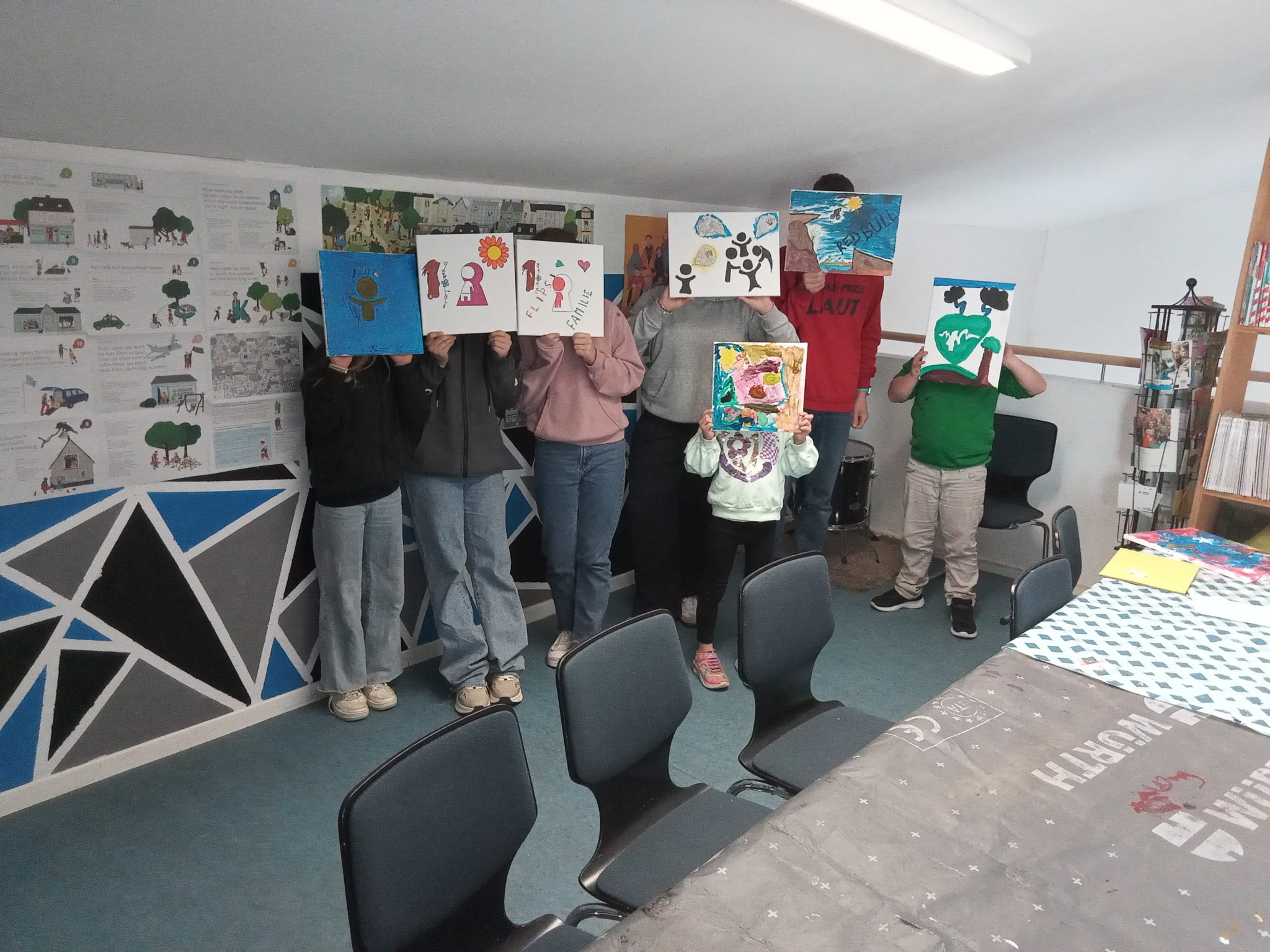 Dann ging es ans eigene Gestalten. Während einige sofort zu Farben und Leinwand griffen, vertiefte sich eine andere Gruppe in Informationsmaterialien und stellte sich die Frage: Wie werden Kinderrechte eigentlich in anderen Teilen der Welt umgesetzt? Aus ihren Erkenntnissen entwickelten sie ein Quiz- und Suchspiel, das am Ende alle gemeinsam lösten.