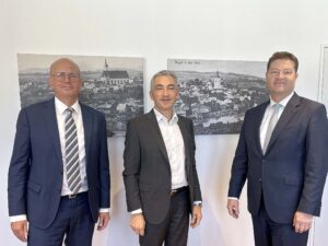 Unser Bild zeigt Landrat Dr. Ronny Raith (Bildmitte) mit Rodenstock CEO Marcus Desimoni (re.) und Rodenstock COO Roland Dimbath. Foto: Heiko Langer / Landratsamt Regen