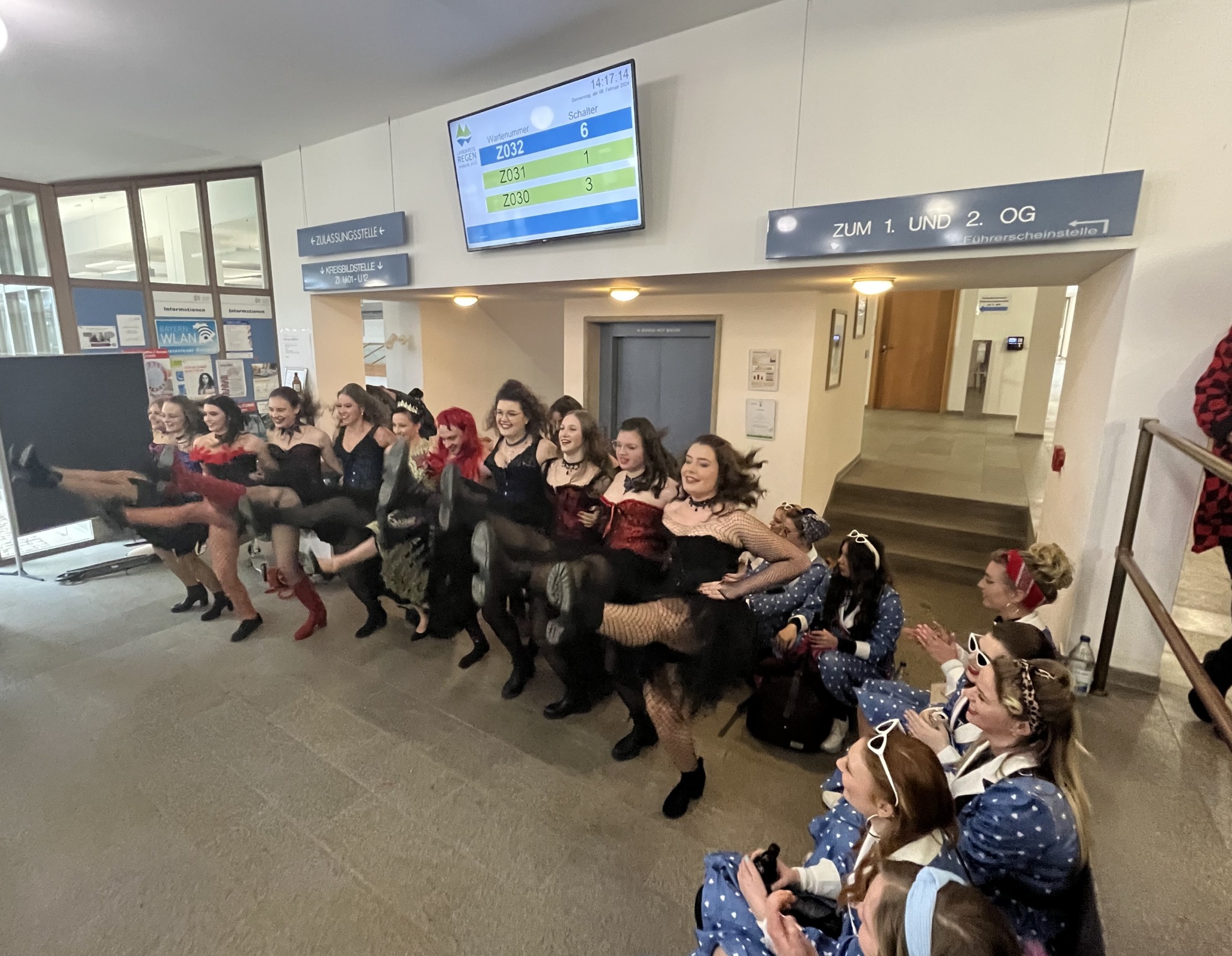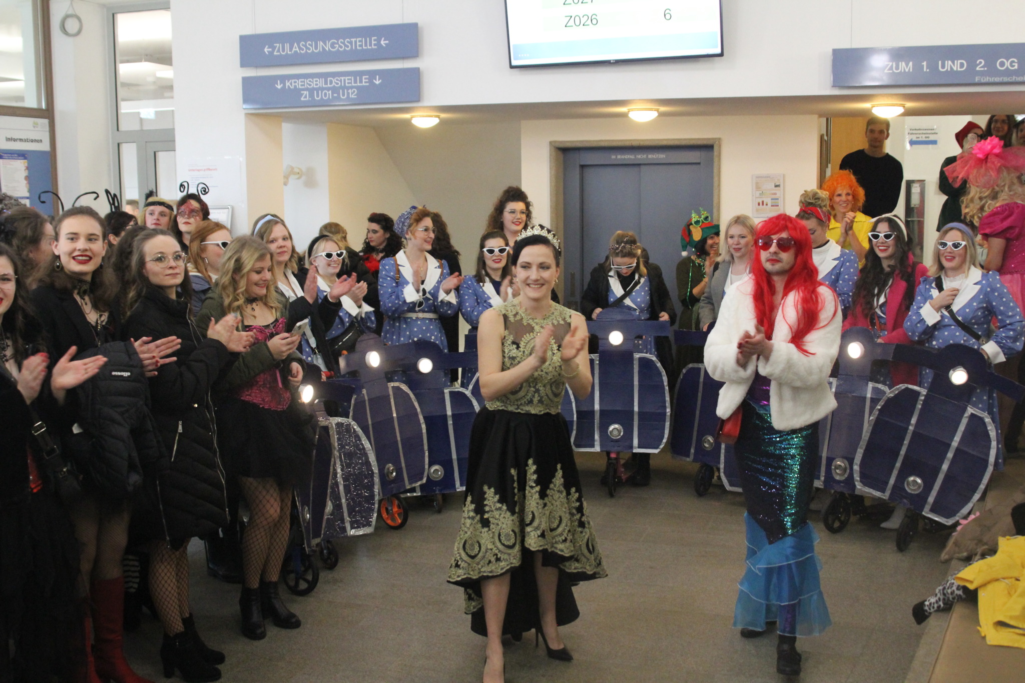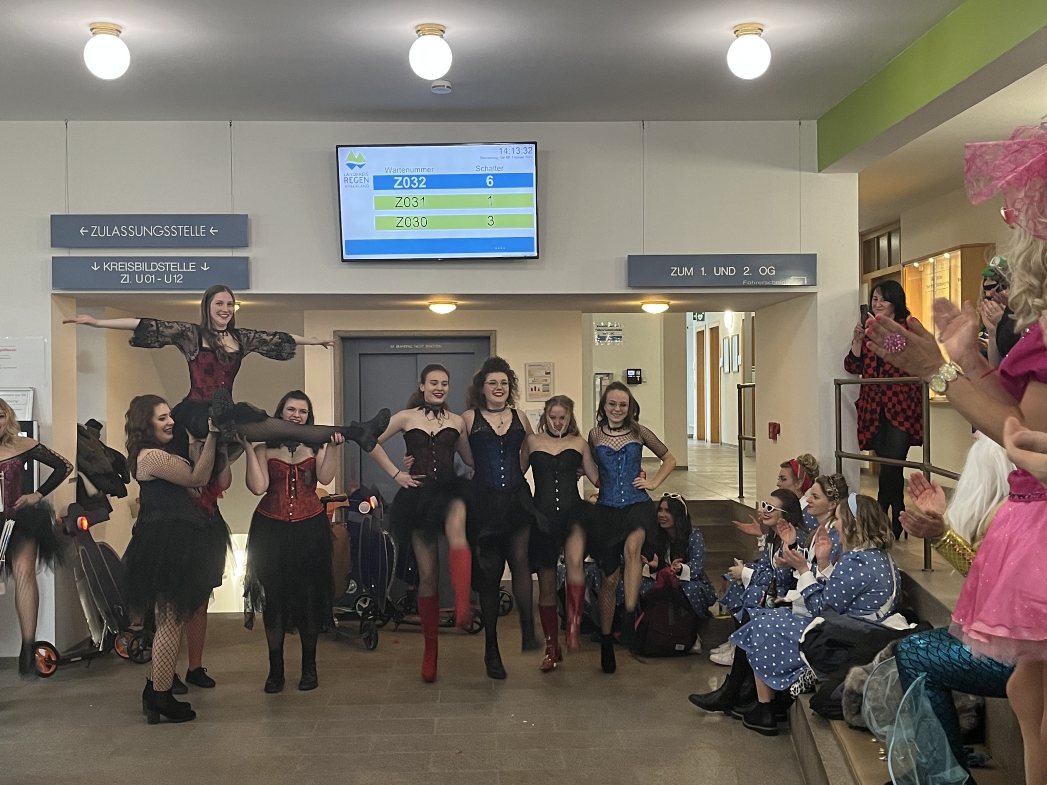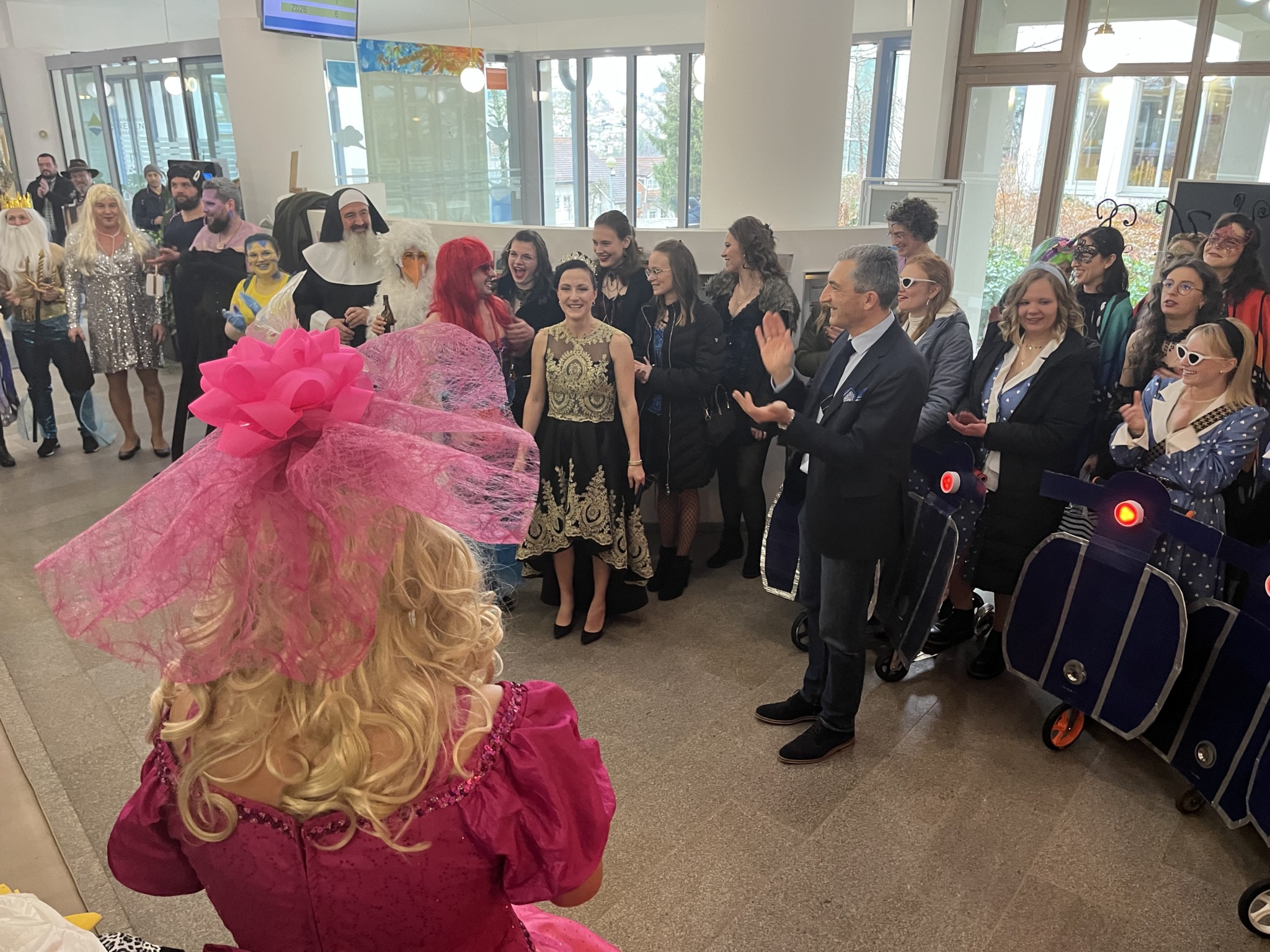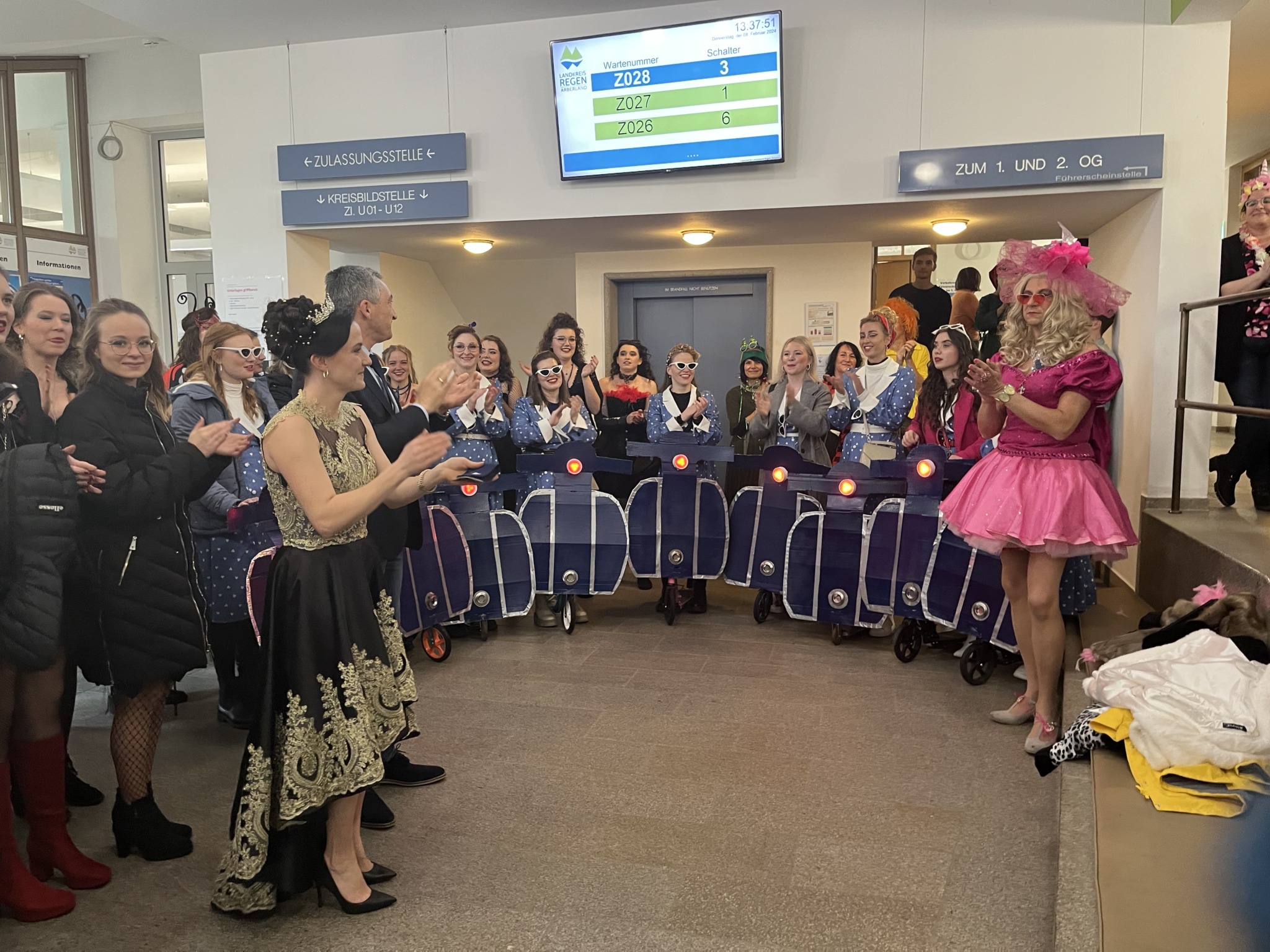 Einzug der Narregenia ins Landratsamt unter dem Applaus von Landrat Dr. Ronny Raith (li.) und seinen Mitarbeiterinnen und Mitarbeitern. Foto: Iris Gehard / Landratsamt Regen