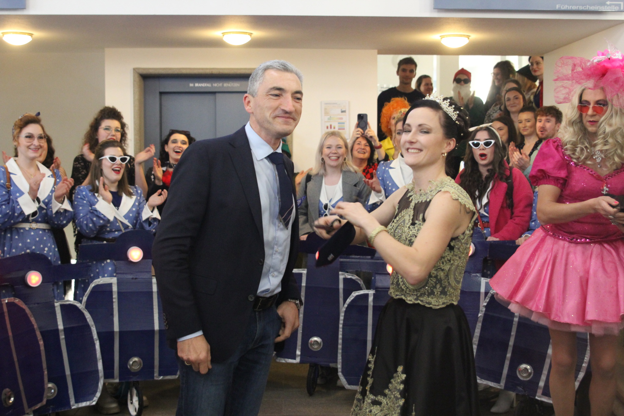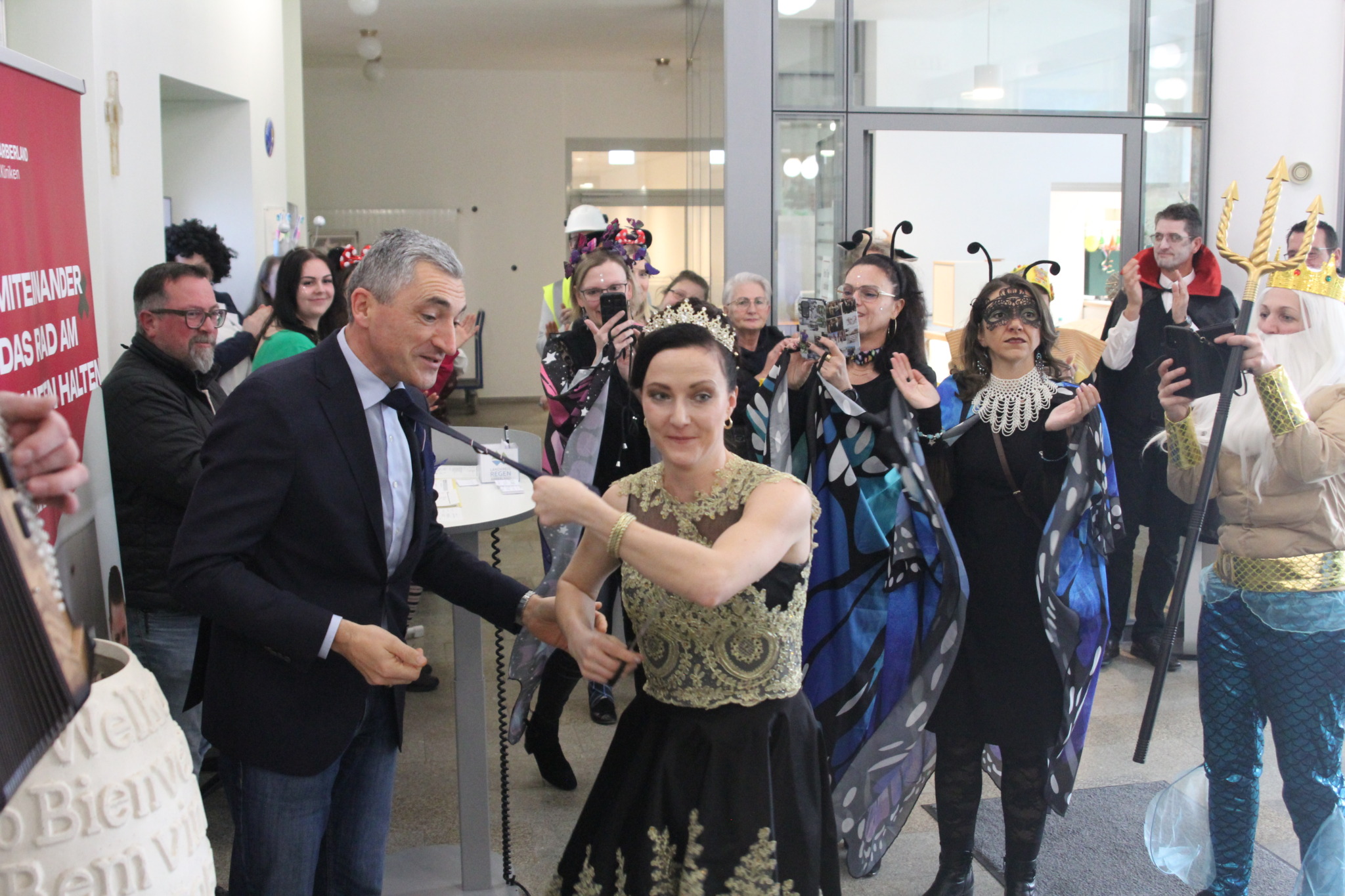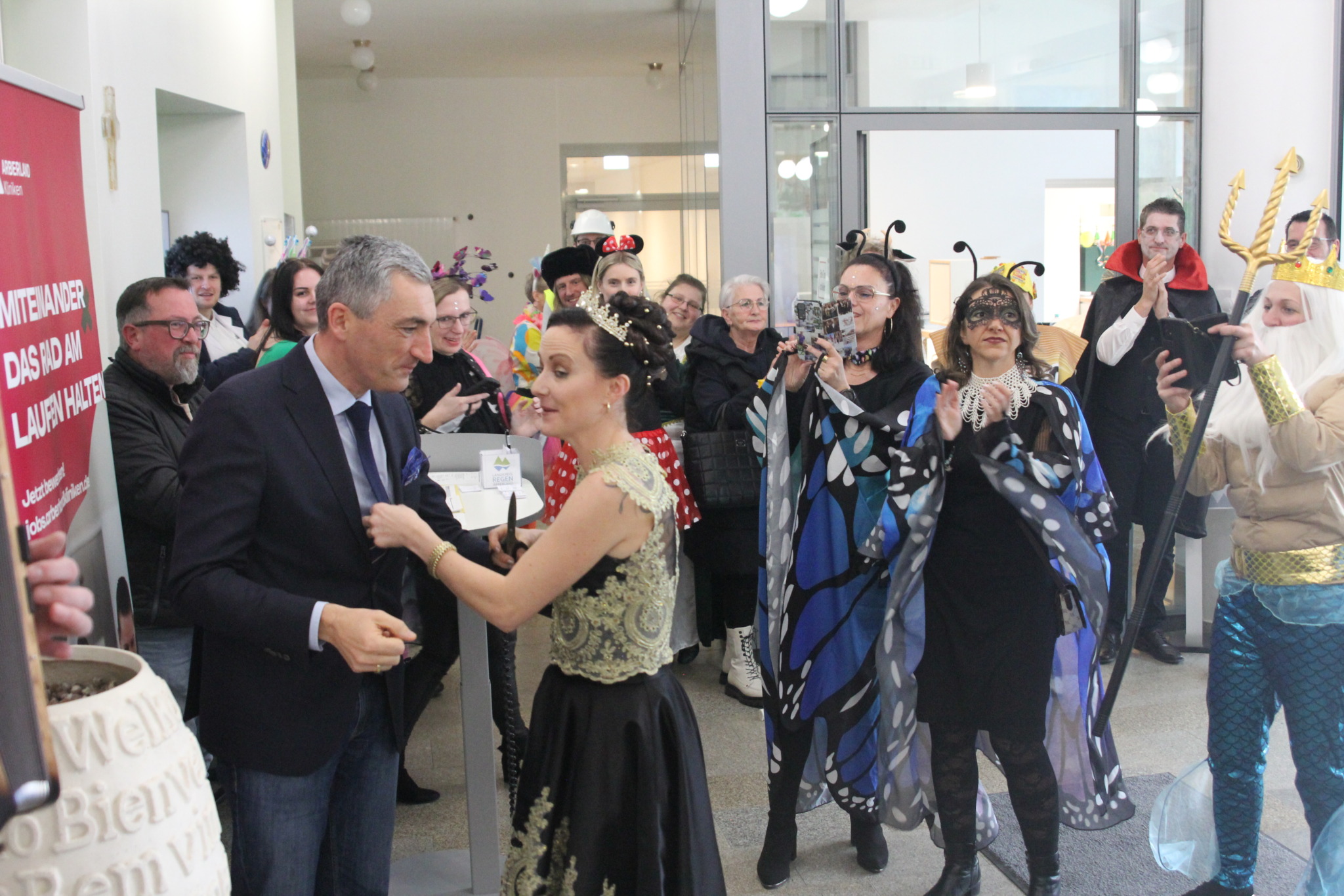 Regen. Am Unsinnigen Donnerstag kam die Narregenia ins Landratsamt und verbreitete Faschings-Feierlaune. Begrüßt wurden die Närrinnen und Narren vom Landrat und vielen ebenfalls fröhlich verkleideten Mitarbeitern mit Sekt und Faschingskrapfen. Schon nach wenigen Minuten war die Krawatte des Landrats nach einem beherzten Schnitt mit der Schere ab.