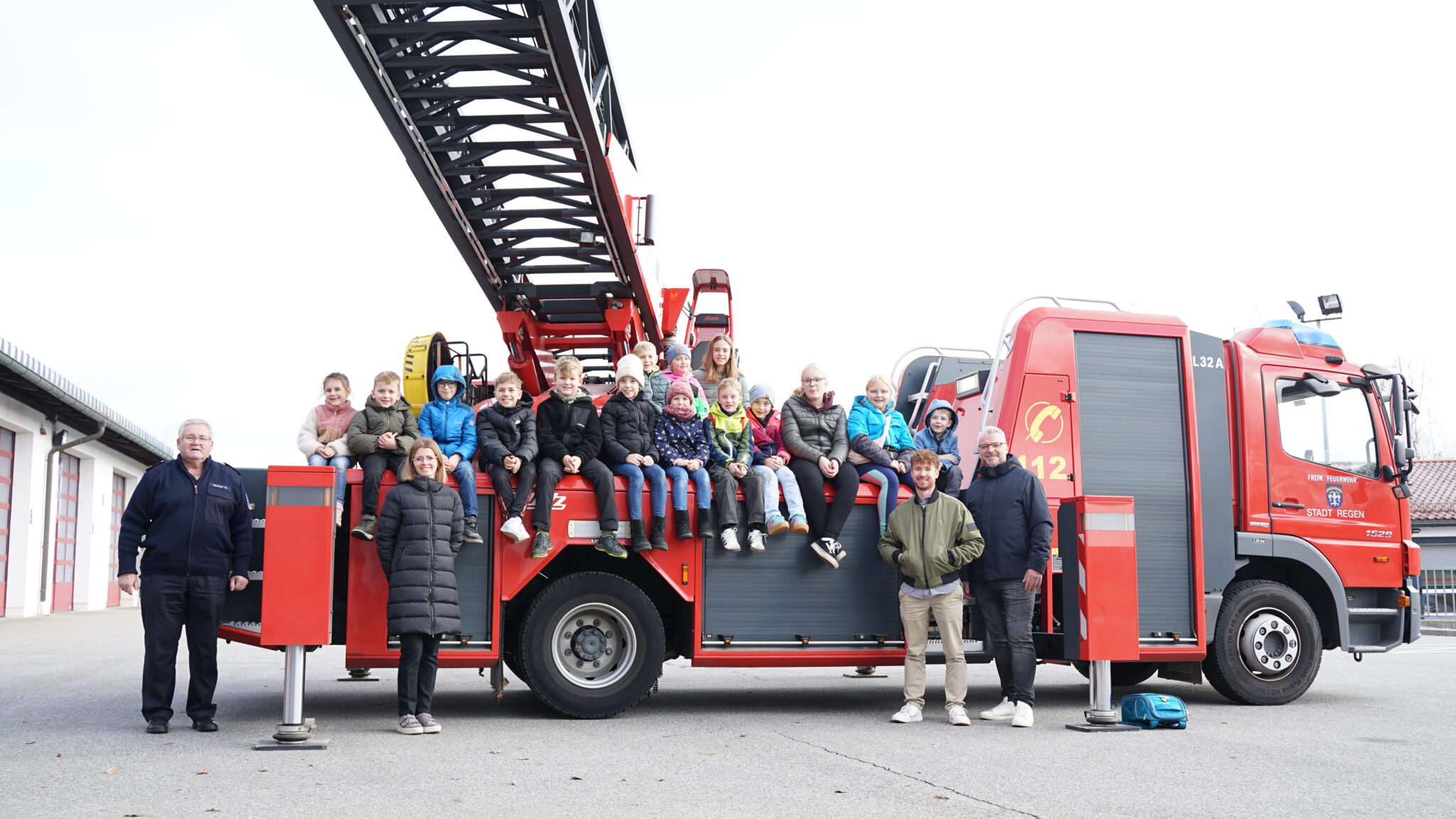 Nach dem kreativ von Mitarbeiterinnen des Jugendamtes vorbereiteten Warm-up ging es zur Stadtfeuerwehr Regen – und dort stieg die Spannung. In der Atemschutzübungsanlage tasteten sich die Mädchen und Jungen durch einen abgedunkelten Parcours, probierten die Technik der Kommandozentrale aus und staunten über die Infrarotkamera, die selbst in dichtem Nebel klaren Durchblick schafft. Kreisbrandmeister Atemschutz Hans Richter führte die Gruppe mit einer besonderen Mischung aus Fachwissen und bester Kinderversteher-Qualität von Station zu Station. Als draußen dann noch ein Einsatzfahrzeug samt 30-Meter-Drehleiter wartete, war endgültig klar: Dieser Tag gehört ganz oben auf die Liste „Coolste Schultage ohne Schule“.