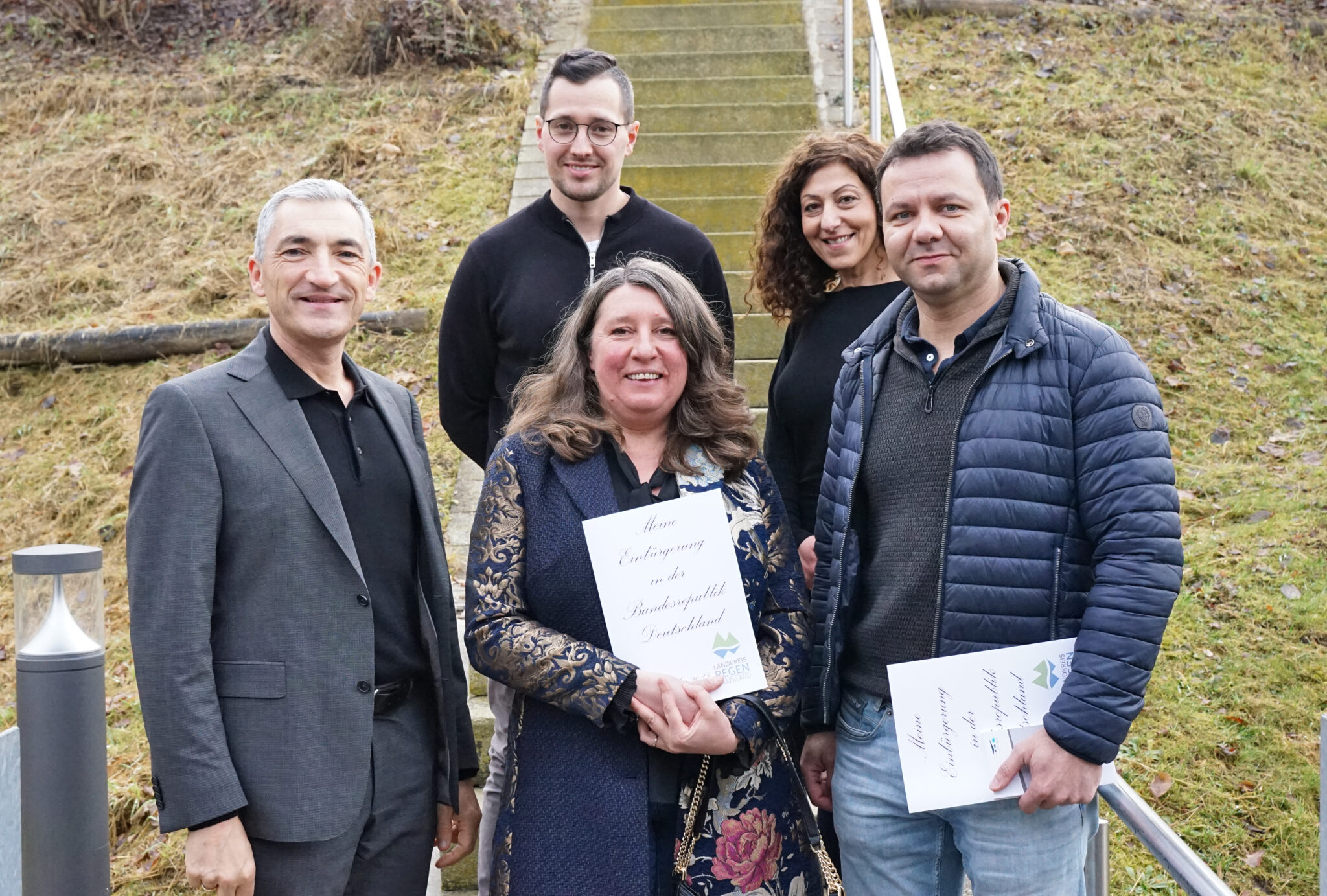 Auf unserem Bild sehen Sie v. li.: Landrat Dr. Ronny Raith, Michael Spielbauer und Yildiz Oragaz vom Ausländeramt sowie Hanna Cronenberg und Carol-Cristian Kocs mit ihren Einbürgerungsurkunden rechts. Foto: Miriam Lange / Landkreis Regen.